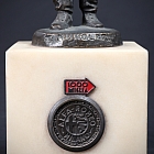Le bronze, à la patine sombre subtilement nuancée, repose sur un élégant socle en marbre clair, orné d’un médaillon Alfa Romeo – 1000 Miglia, soulignant le lien direct avec cette course légendaire et l’histoire de la marque milanaise.