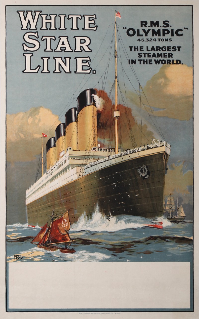 White Star Line Il s'agit de la fameuse affiche officielle qui représente le RMS TITANIC à son lancement , malgré la catastrophe de 1912 , cette affiche perdura avec le nom RMS OLYMPIC sister Ship du paquebot Titanic ,